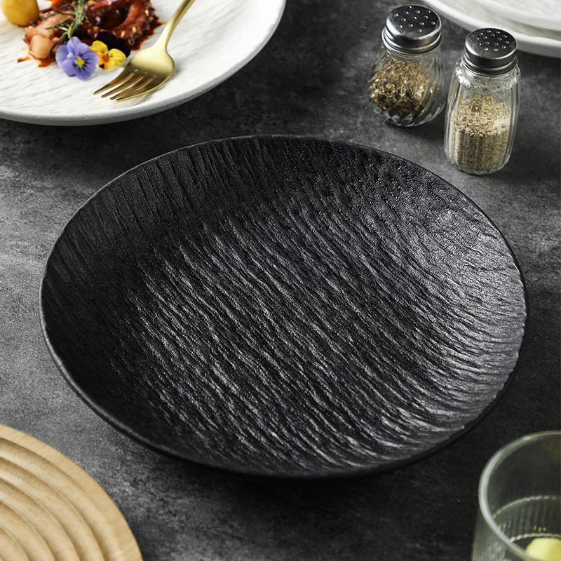 ロックブラックプレートディッシュプレートホームセンスサラダプレートラウンドプレートセラミックプレートクリエイティブディーププレートホテル食器