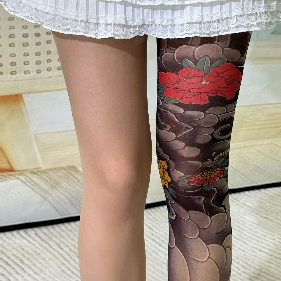 大きいサイズの花の足のストッキングの牡丹のタトゥーの肌の色のギャルのセクシーな大衆のストッキングの薄いタイプの夏の高弾のストッキング