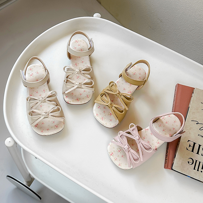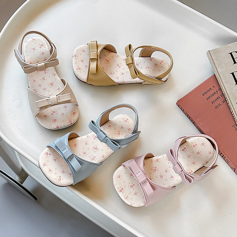 女の子の蝶結びの王女の靴の赤ちゃんの足のビーチの靴の2025夏の新型の女の子の柔らかい底のビーチの靴のフランス式