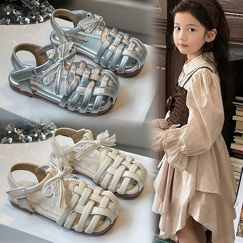 女の子のドーパミンの王女の靴の女の子の蝶結びの大気のサンダル2025夏の新型の大きい子供の柔らかい底のビーチの靴