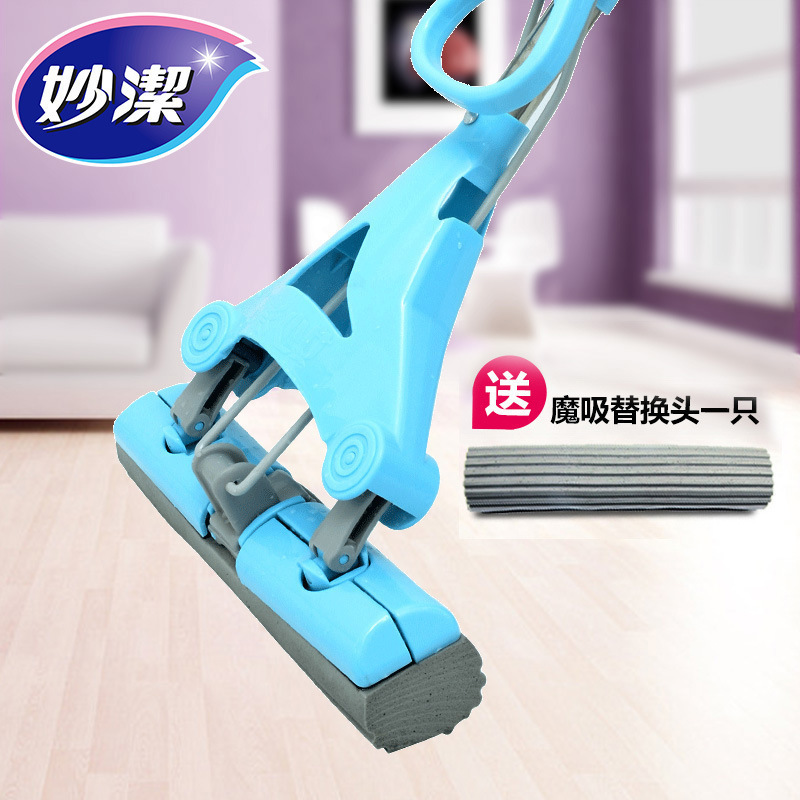 妙潔スポンジモップ二重折り畳み式搾り水免手洗直棒延長家庭用トイレ高密度吸水モップ