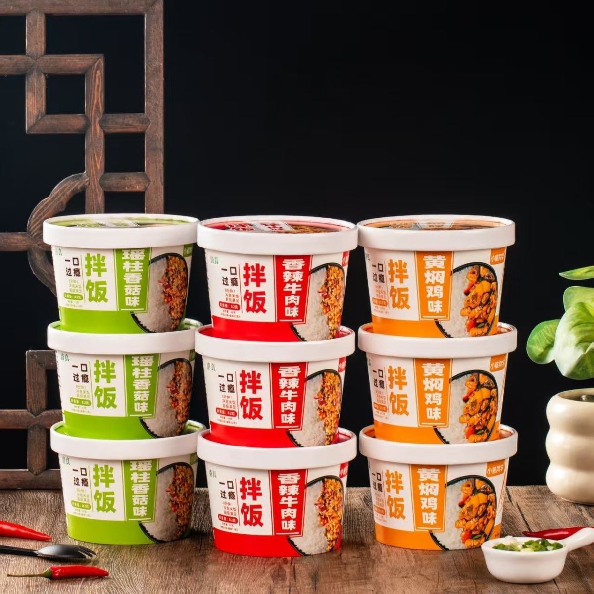 ビビンバ、アワビ、椎茸、スパイシービーフ、鶏の煮込み、ライス、ライスペーパーバケツ、インスタント