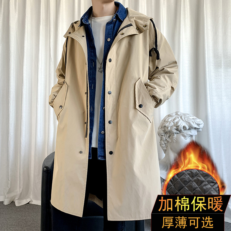 冬のトレンチコートの男性の中の長いタイプのパーカーのコートの韓国版は綿を加えて厚いカップルの帽子の綿入れのファッションのコートをかぶせます。