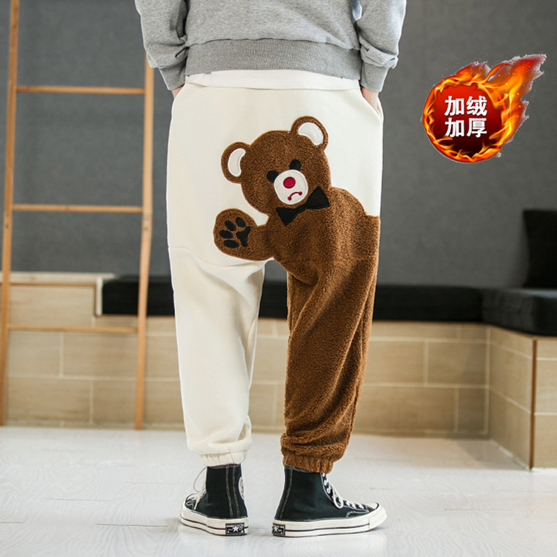 22秋冬の男性は、ベルベットのニットの植毛を厚くして、ベアーの保温ズボンの中国風の足のスポーツパンツの男性を合わせます
