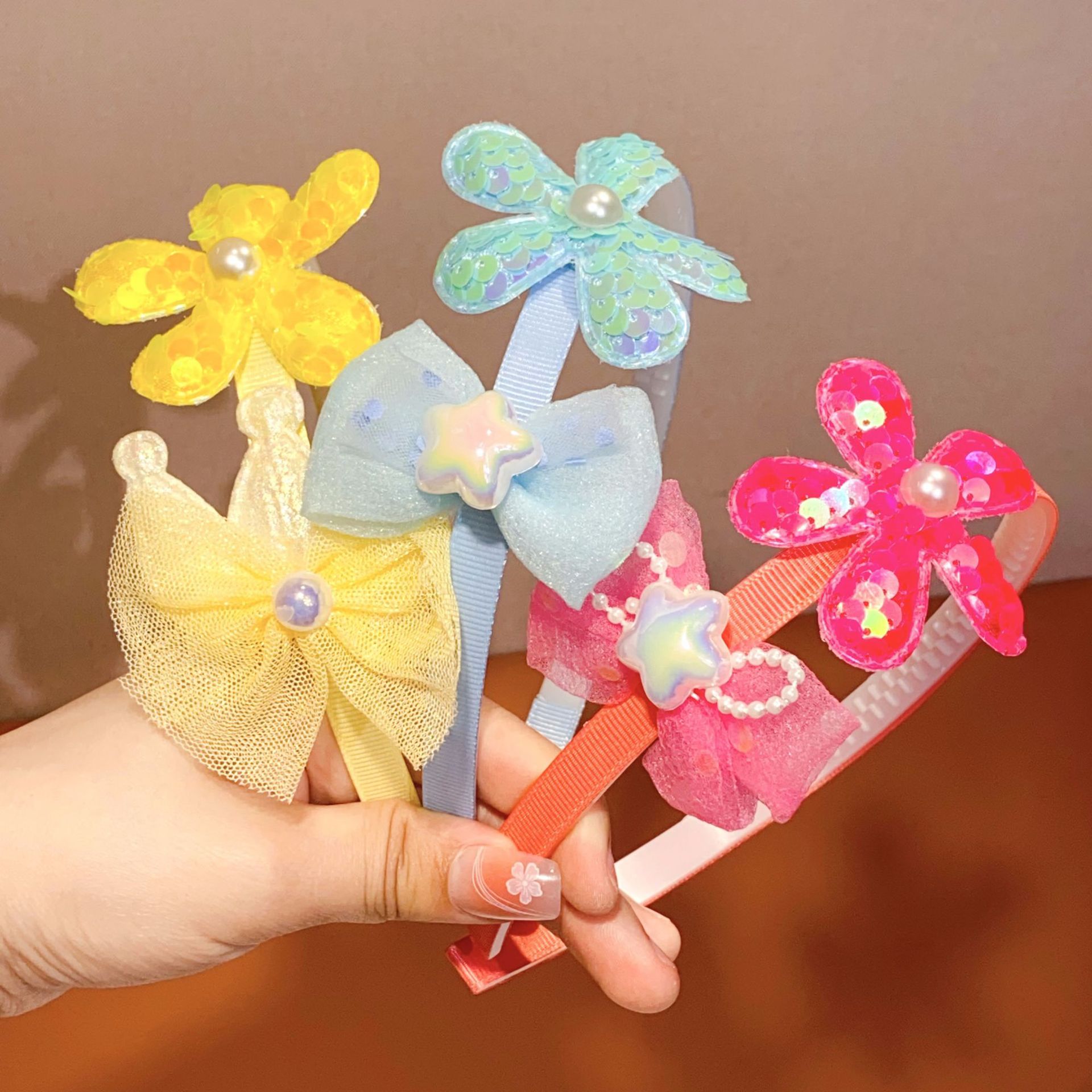 韓国子供用ヘッドバンドインリバーシブルスパンコールパール五角形の花かわいいヘッドバンド歯付き女の子プリンセスヘッドバンド