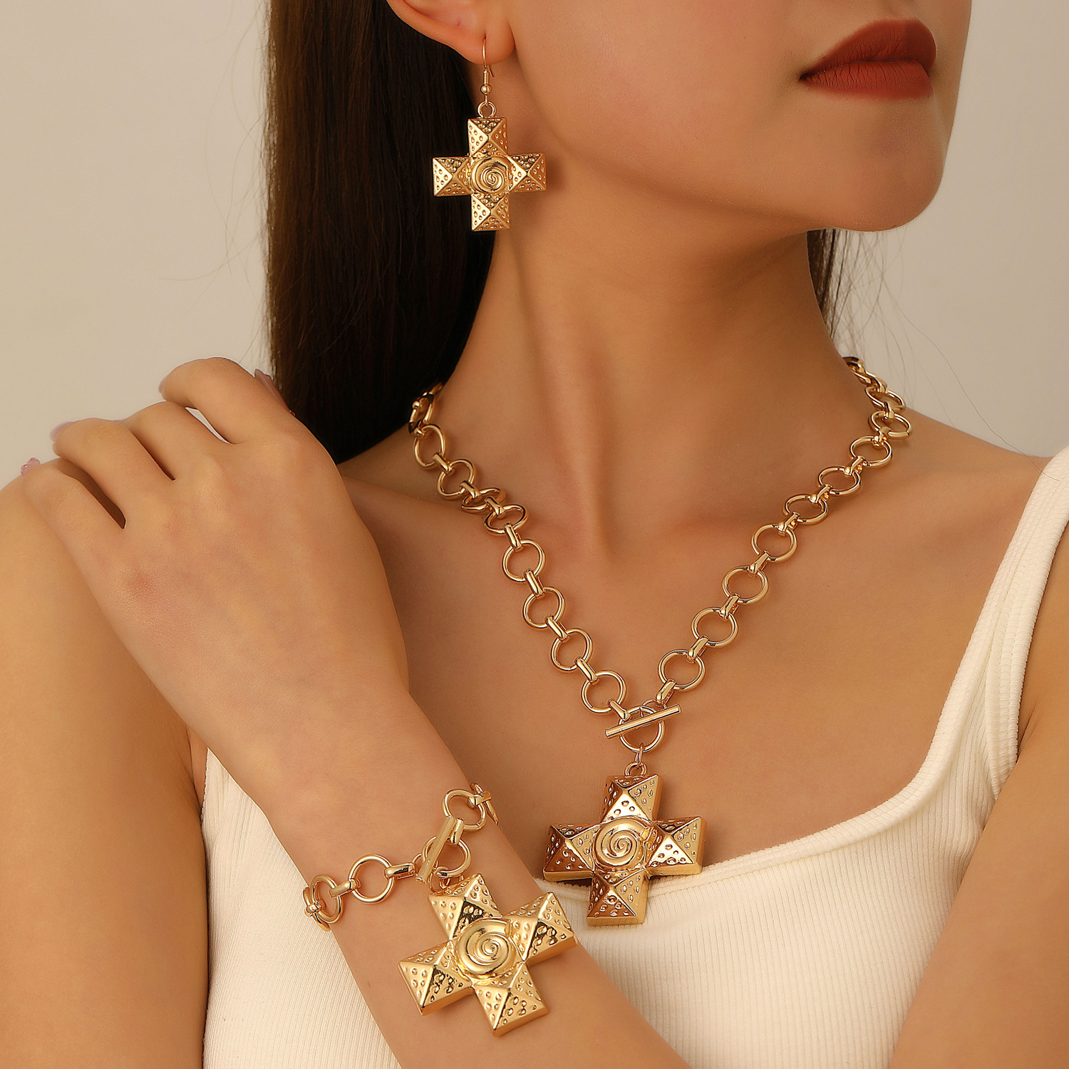 ヨーロッパとアメリカのクロスボーダーライト高級レトロ渦巻きクロス合金イヤリングネックレスブレスレット女性用 3 点ジュエリーセット