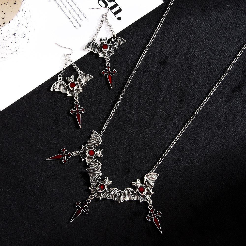 2024新款欧美万圣节首饰套装哥特式黑色蝙蝠流苏项链耳环节日礼物