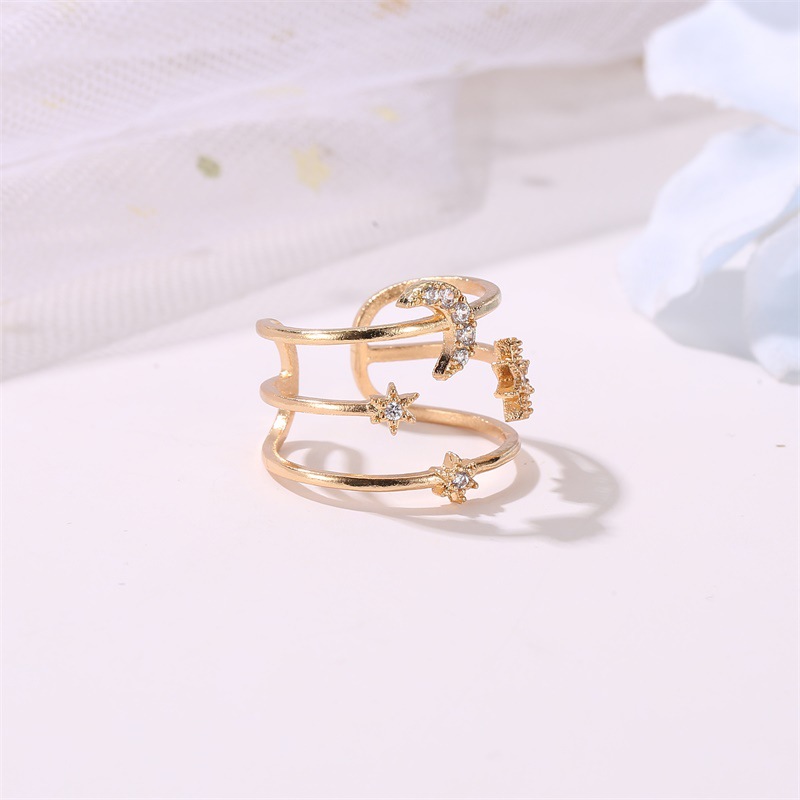 时尚简约微镶锆石星星月亮戒指 开口可调节双层指环女