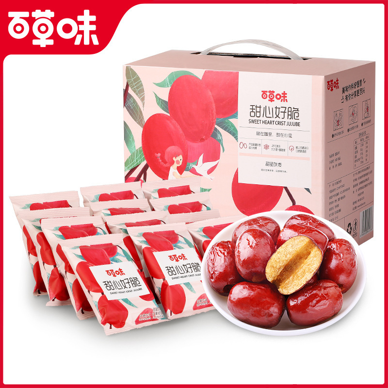 百草味の甘い心が脆くて、ナツメのサクサクしたナツメの核がないナツメのナツメの乾燥した食いしん坊の軽食が箱に入っている