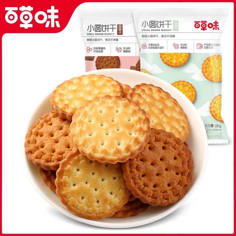 百草味の小さい円のビスケットの100gの箱の規格の60ネットの赤い日式の小さい円のビスケットは飢えのネットの赤いレジャーの間食の卸売りを満たします。