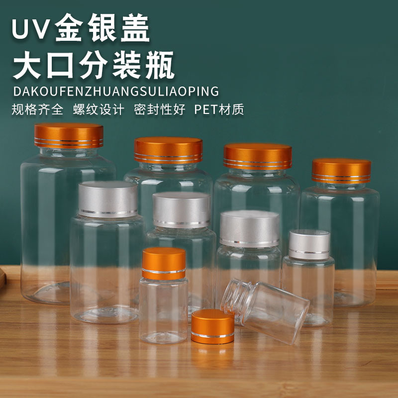 メーカースポットuv金銀蓋大口透明分注ボトルpetペットボトルカプセル固体包装ボトルサンプルボトル