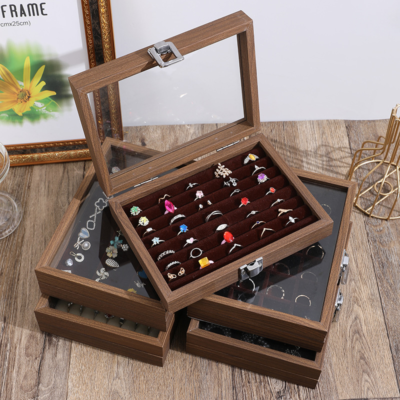 ガラス蓋宝石箱胡桃色指輪ネックレスイヤリングジュエリー箱展示盤家庭収納蓋付きジュエリー箱