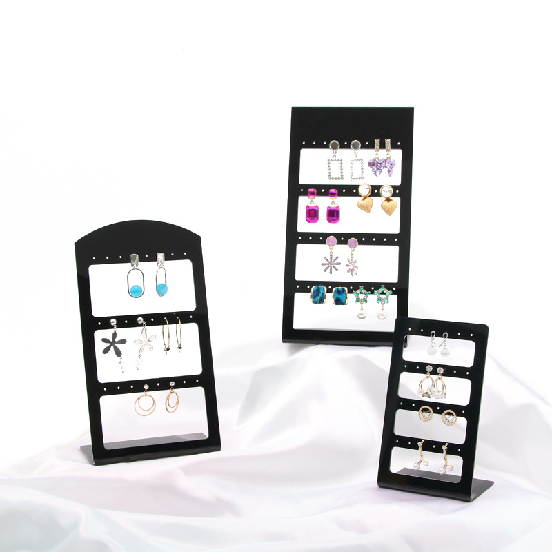 アクリルのアクセサリー棚の黒い透かし彫りのピアスのイヤリングのイヤリングのペンダントの宝石の陳列展示は撮影の屋台の道具を並べます。