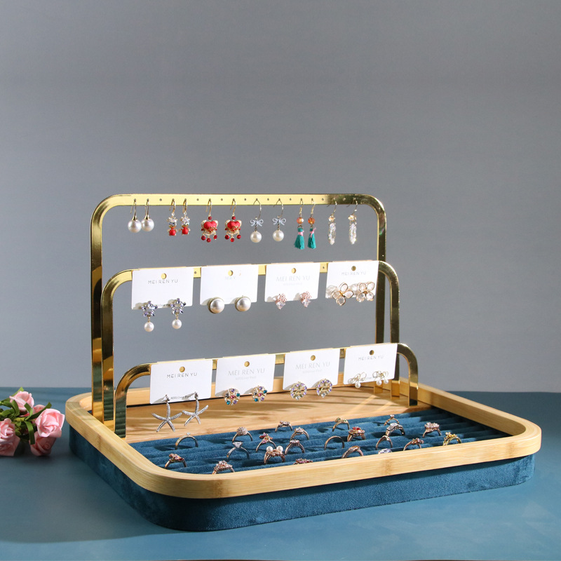金属製のアクセサリー棚竹のベルベットの3層のイヤリング棚のイヤリングのイヤリングの指輪のブレスレット棚の陳列展示道具