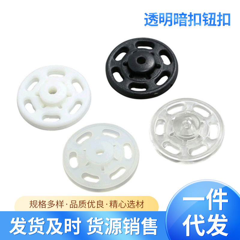 メーカー既製プラスチック手縫いスナップボタン、目に見えない隠しボタン、7-25mm下着スナップボタン、黒と白の透明スナップボタン