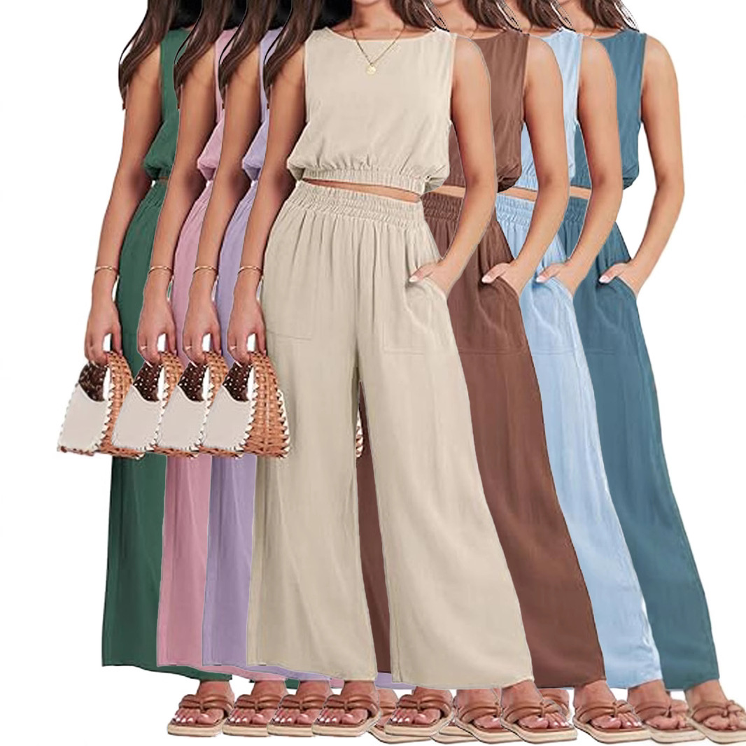 欧米の2025春の国境を越えたアマゾンの女性服のカジュアルな丸首の袖なしの緩めた裾の高い腰の広い足の2つのセット