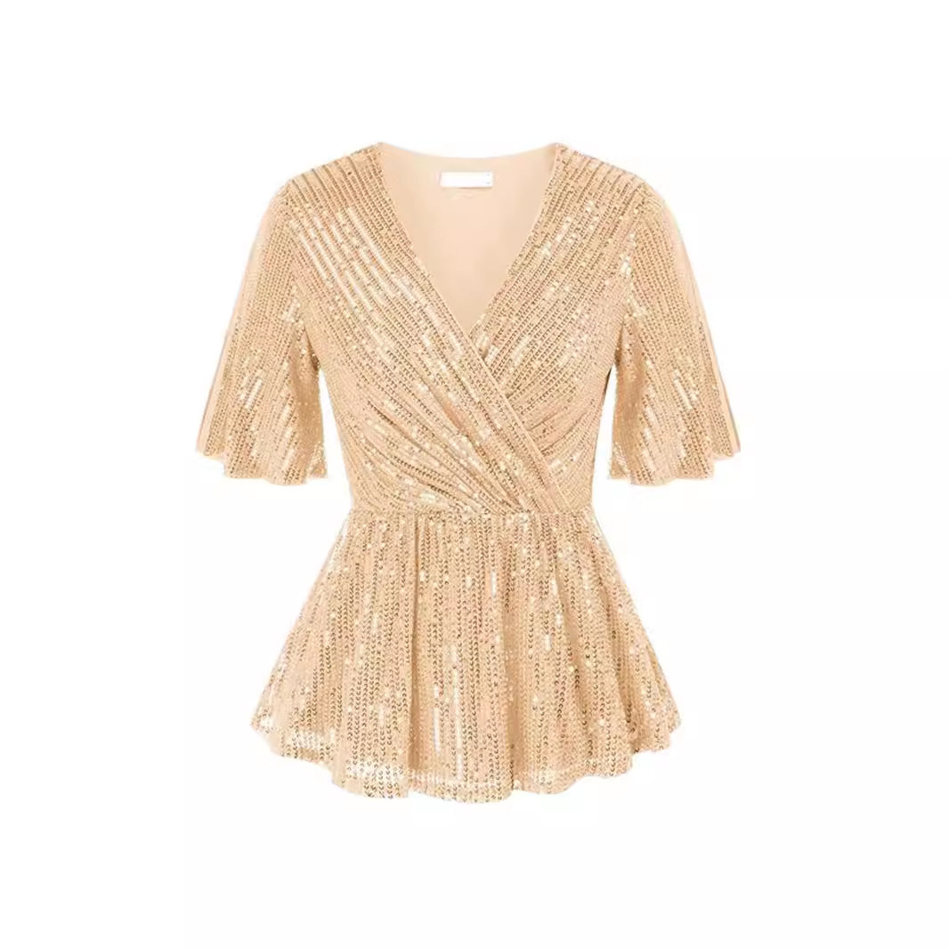 欧米の2024夏のアマゾンの女性のスパンコールの上着vネックの半袖の輝くドレスの上着の修身パーティー