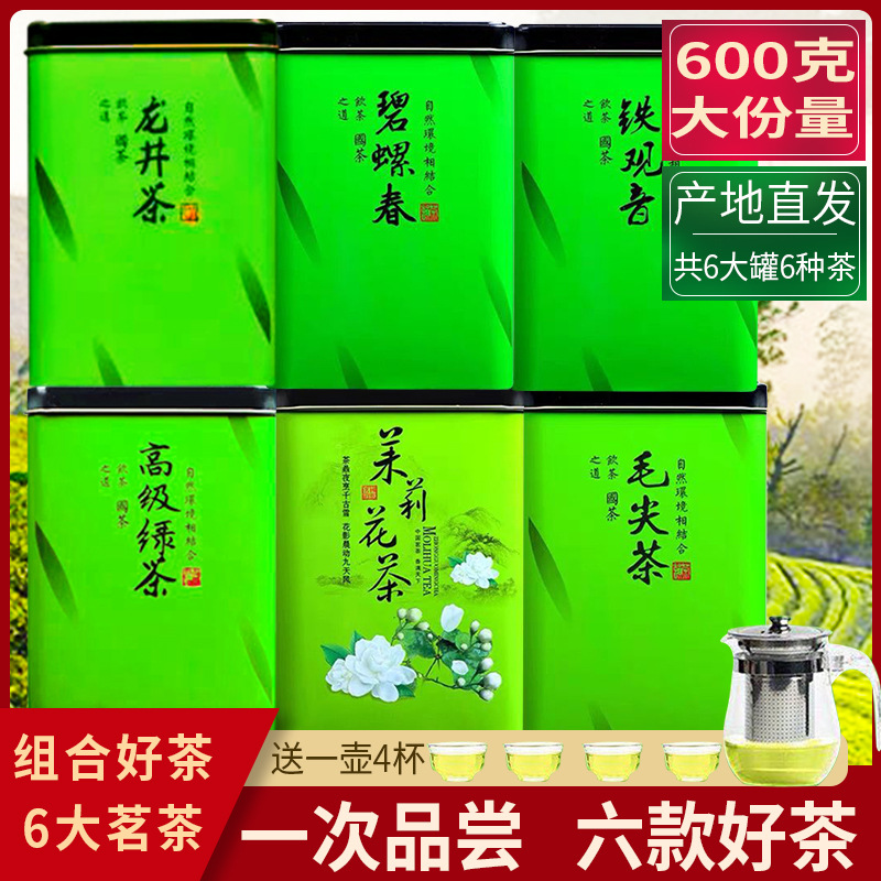 6大茗茶セット6缶入り合計600g鉄観音緑茶ジャスミン茶毛尖茶龍井茶碧ナット春茶