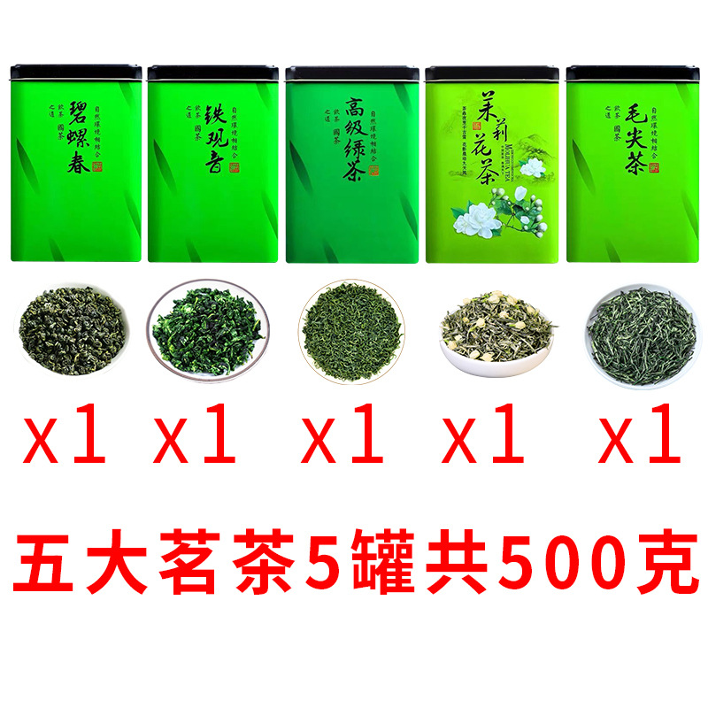 5大茗茶セット5缶セット合計500g碧ナット春雲霧緑茶毛尖茶ジャスミン茶鉄観音茶葉