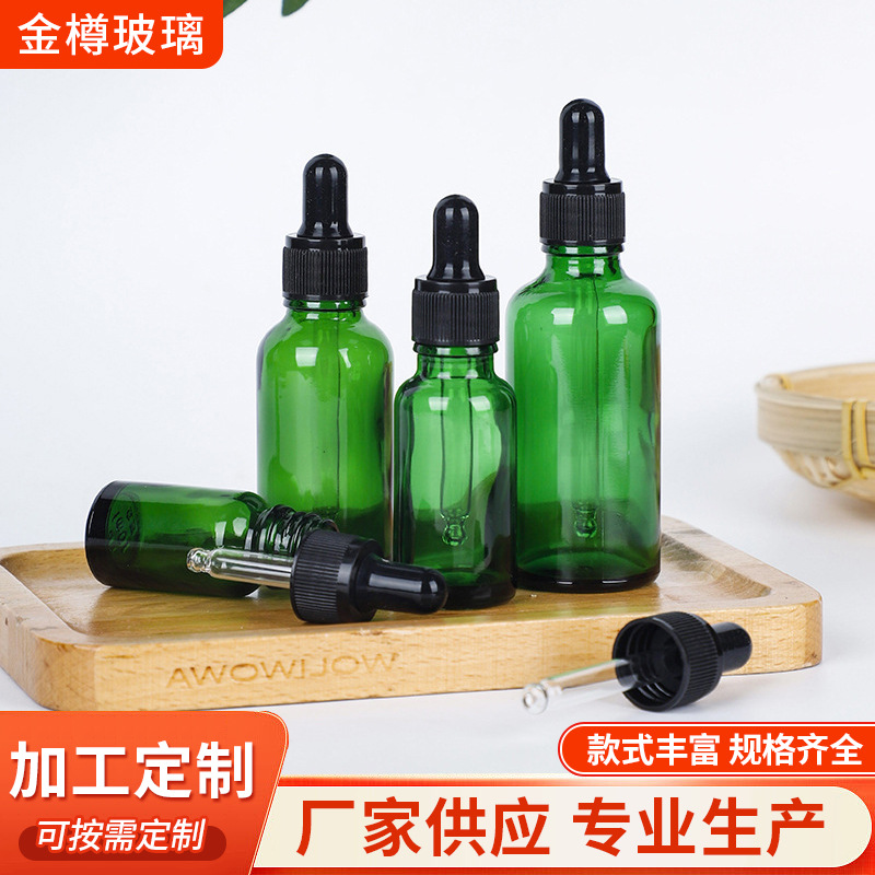 スポイトエッセンシャルオイル分注ボトルガラススキンケア原液サンプルボトル卸売グリーンガラス化粧品エッセンシャルオイルボトル