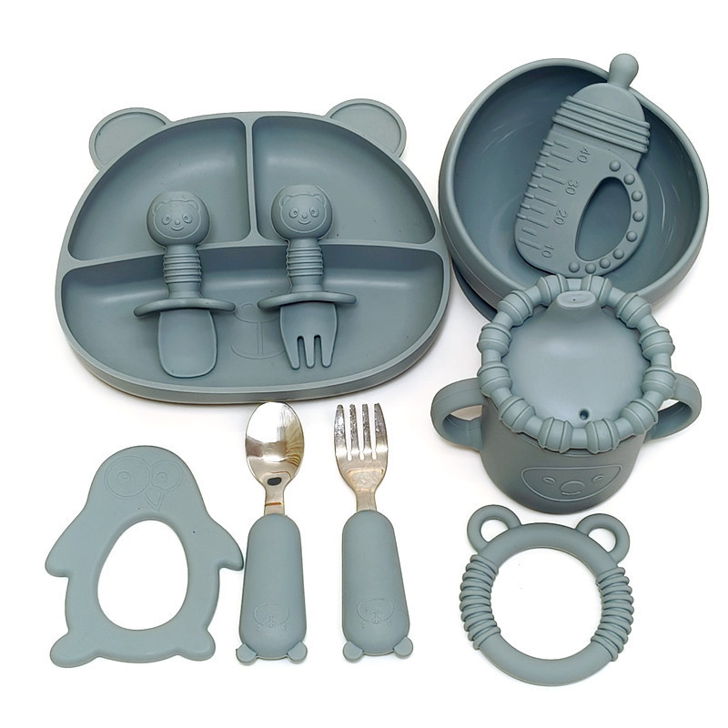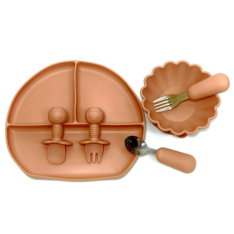 子供用食器三格子プレートプラチナシリカゲルステンレス鋼フォークスプーン吸盤碗短フォークスプーン補食工具セット