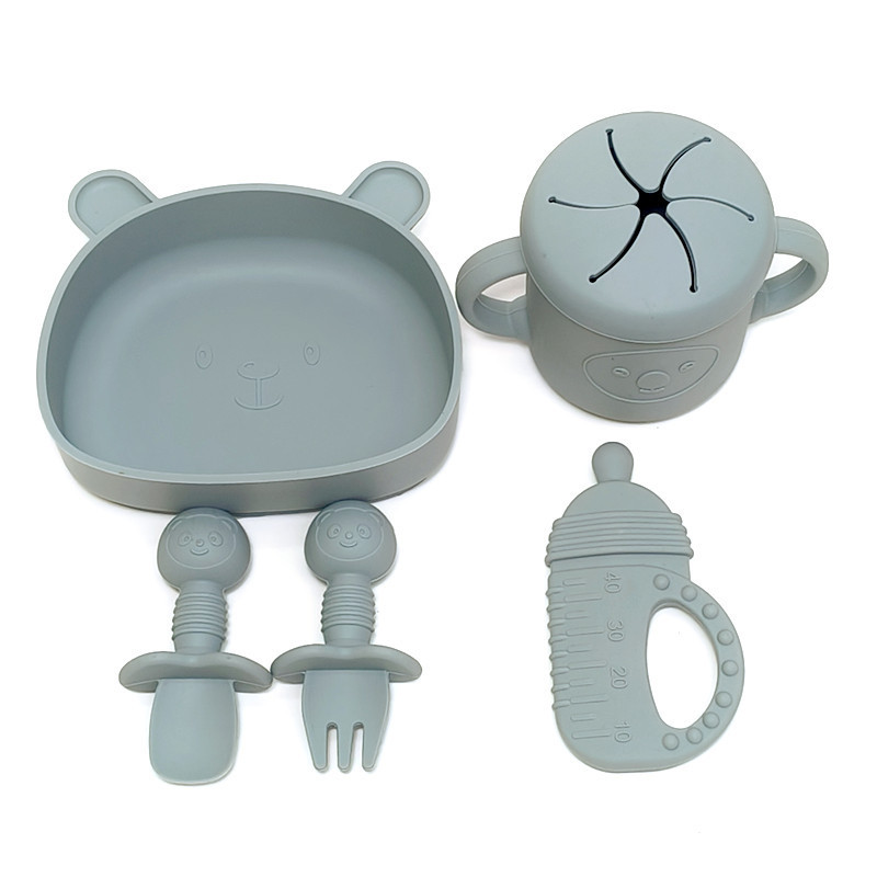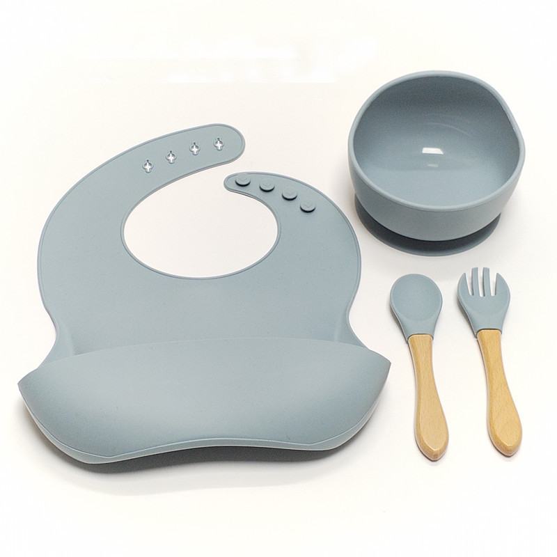 赤ちゃんのシリカゲルの補助食器セットのシリカゲルの碗のスプーンの吸盤の補助食器のスプーンの囲みの食事の皿のセットの食品級