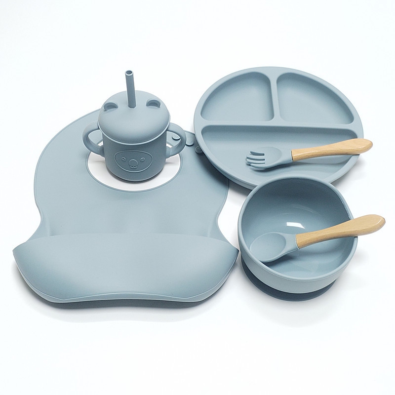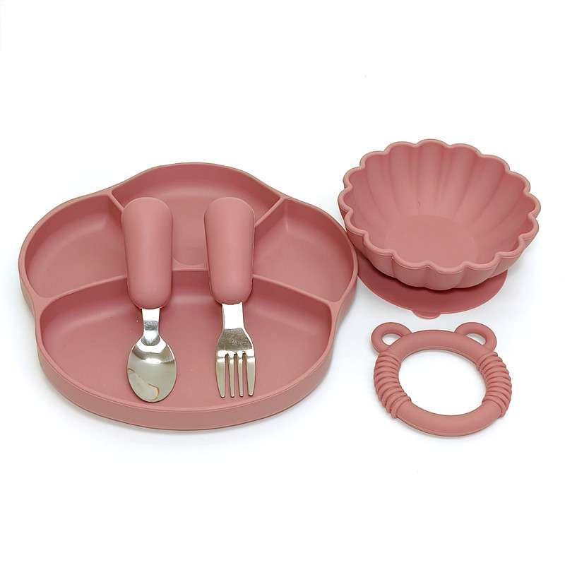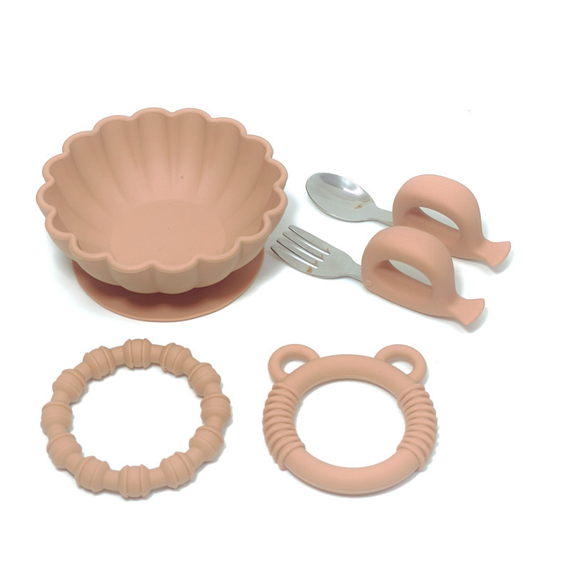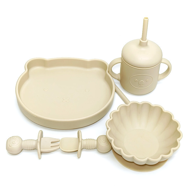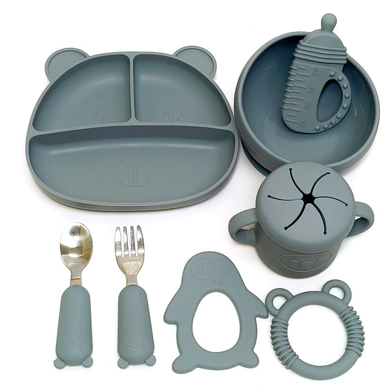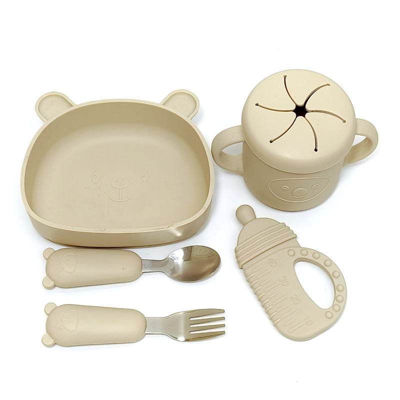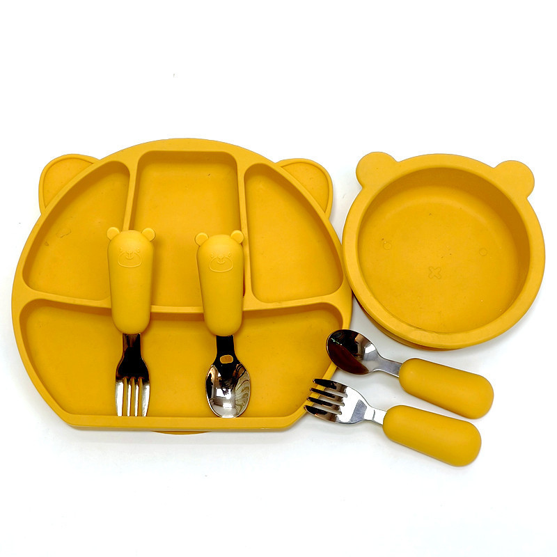シリカゲル赤ちゃん補助食食器セットシリカゲル食器スプーン吸盤補助食器ステンレスフォークスプーン歯ゴム学飲カップ