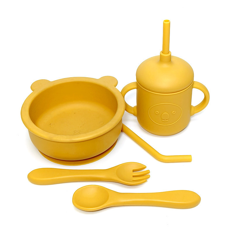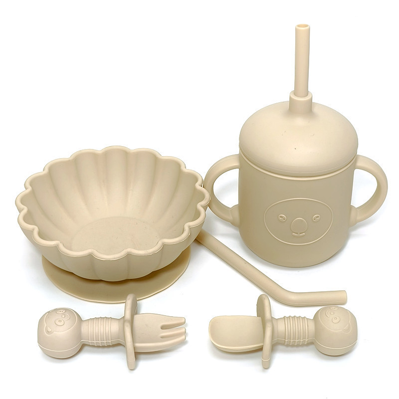 シリカゲル食器吸盤一体式ベビー子供シリカゲルストロー碗補助食器スプーン食事トレーニングスプーン食器セット