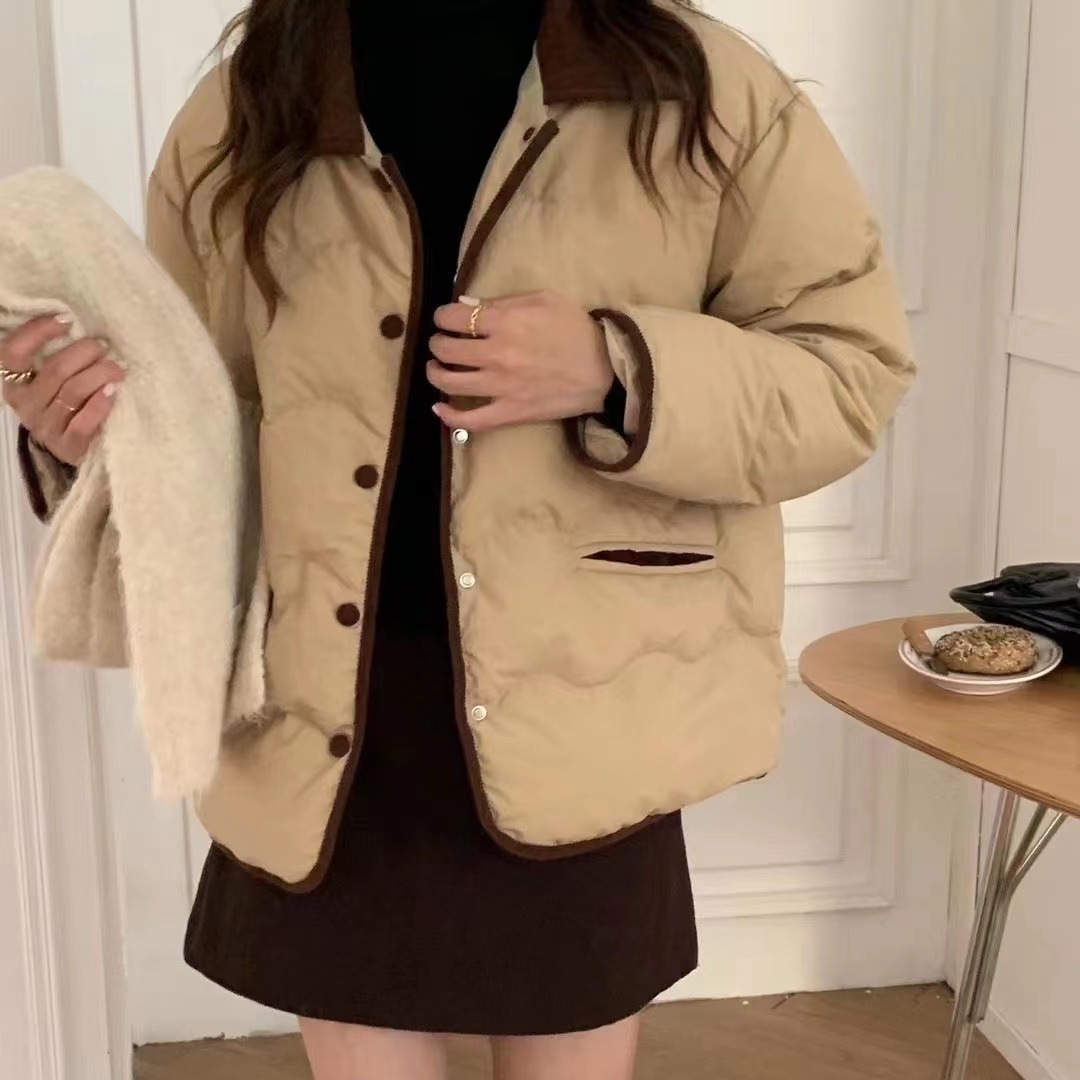 新しいスタイルの作業服、香港スタイル、ファッショナブルで多用途、コントラストカラー、ルーズカジュアルラペルステッチ、厚手のコットンコート、女性用ダブルブレスト