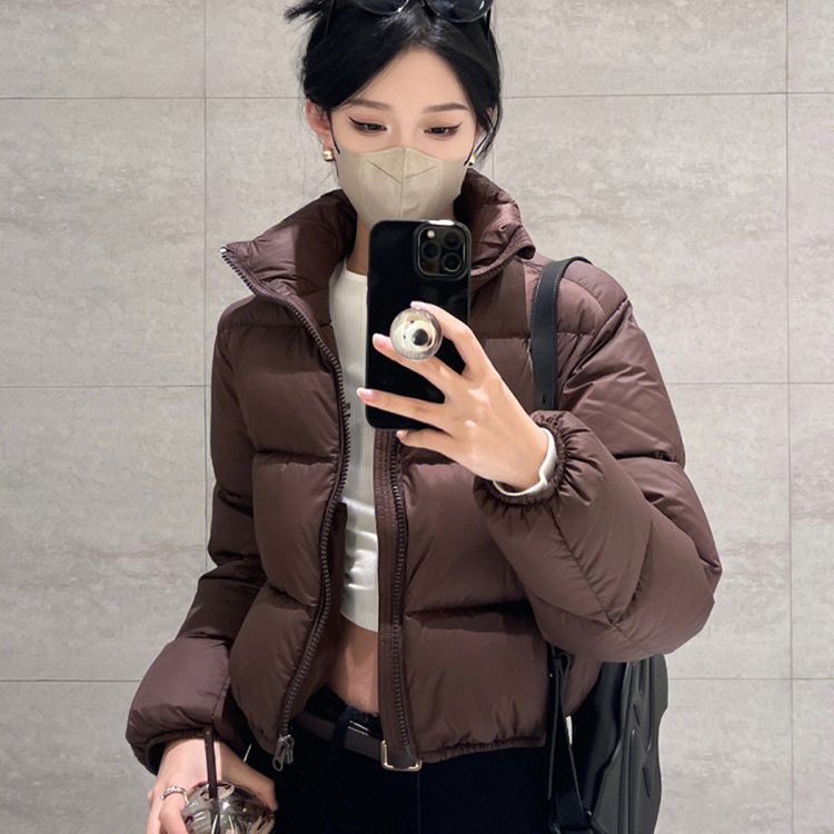 ブラウンの野球ユニフォーム風ジャケット、女性用、冬用、高級感、2025年、スタンドカラー、ショート丈、厚手、ダウンコットン入り
