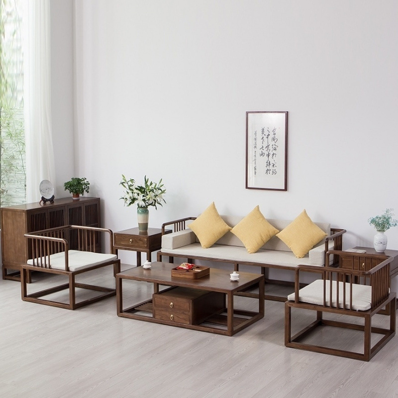 新しい中国式のソファーの実木は簡単で3人のシングルの小さい部屋型の客間のソファーは古い楡木の禅意の家具を組み合わせます。
