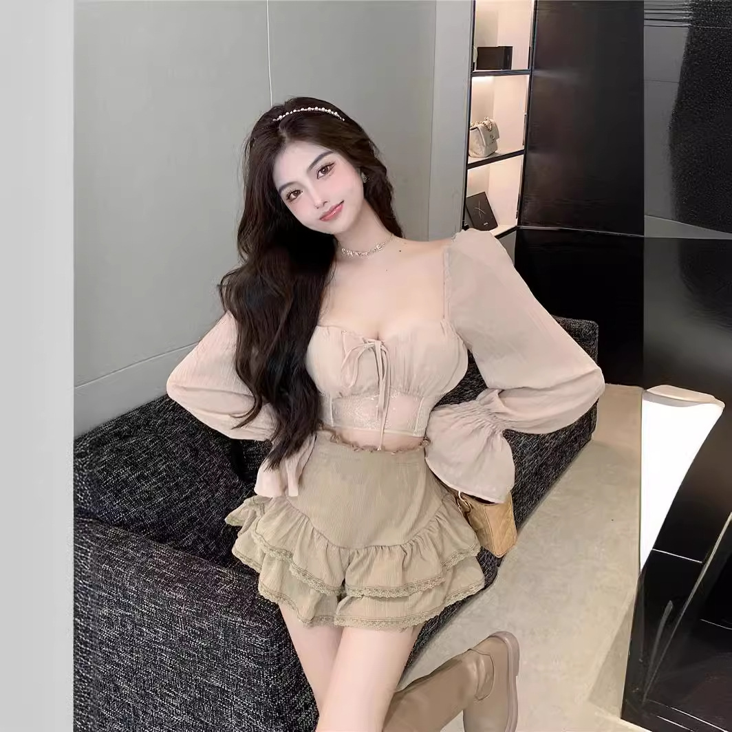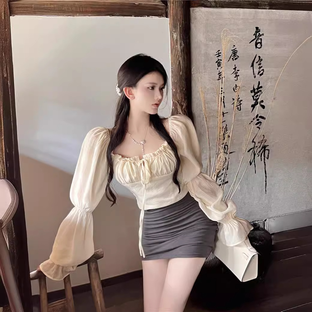 杏色の四角い襟の長袖のシフォンのシャツの女性の秋の結び目は短いタイプの日焼け止めのシャツの1字の肩の鎖骨の独特な上着を持ちます。
