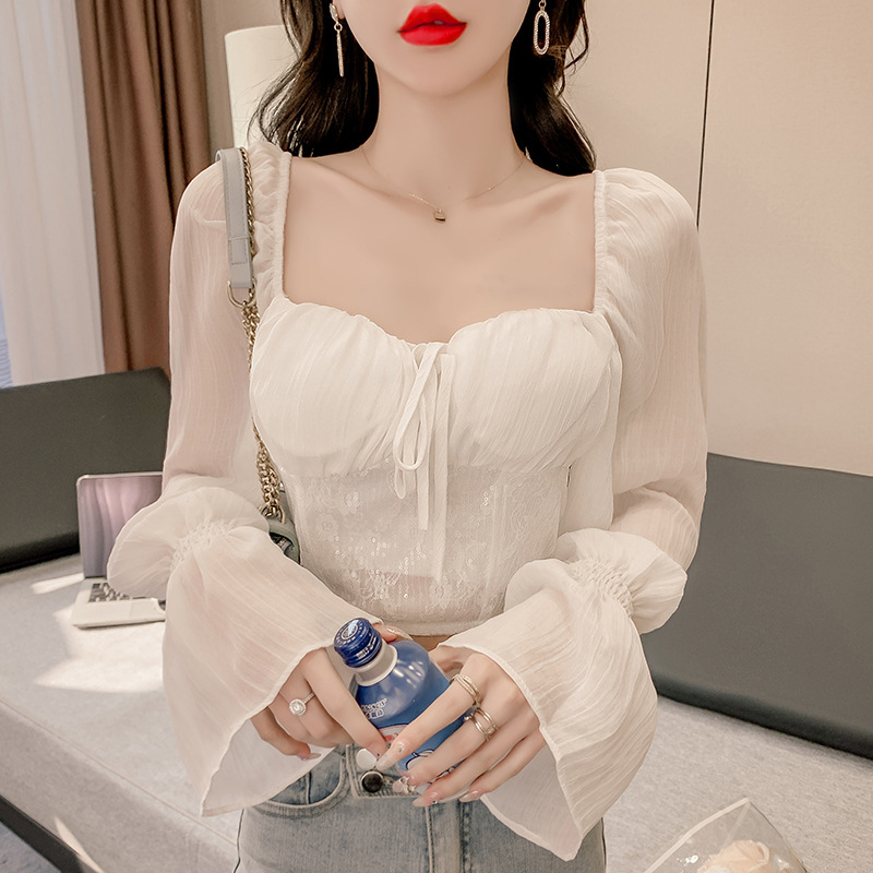 実写2022春夏新作重工気質角襟シフォンシャツ上着ラッパ袖優しいブラウス