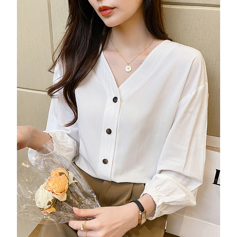Vネックの白いシャツの女性の高級感の気質のカジュアルなシャツの2022の新型の春と秋の長袖の綿