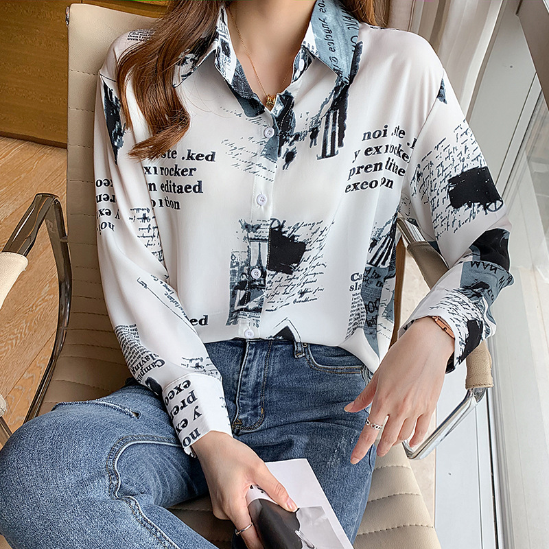 フランスの水墨の落書きのプリントのシャツの上着の女性の2021秋の新型の白いゆったりしているシャツの潮