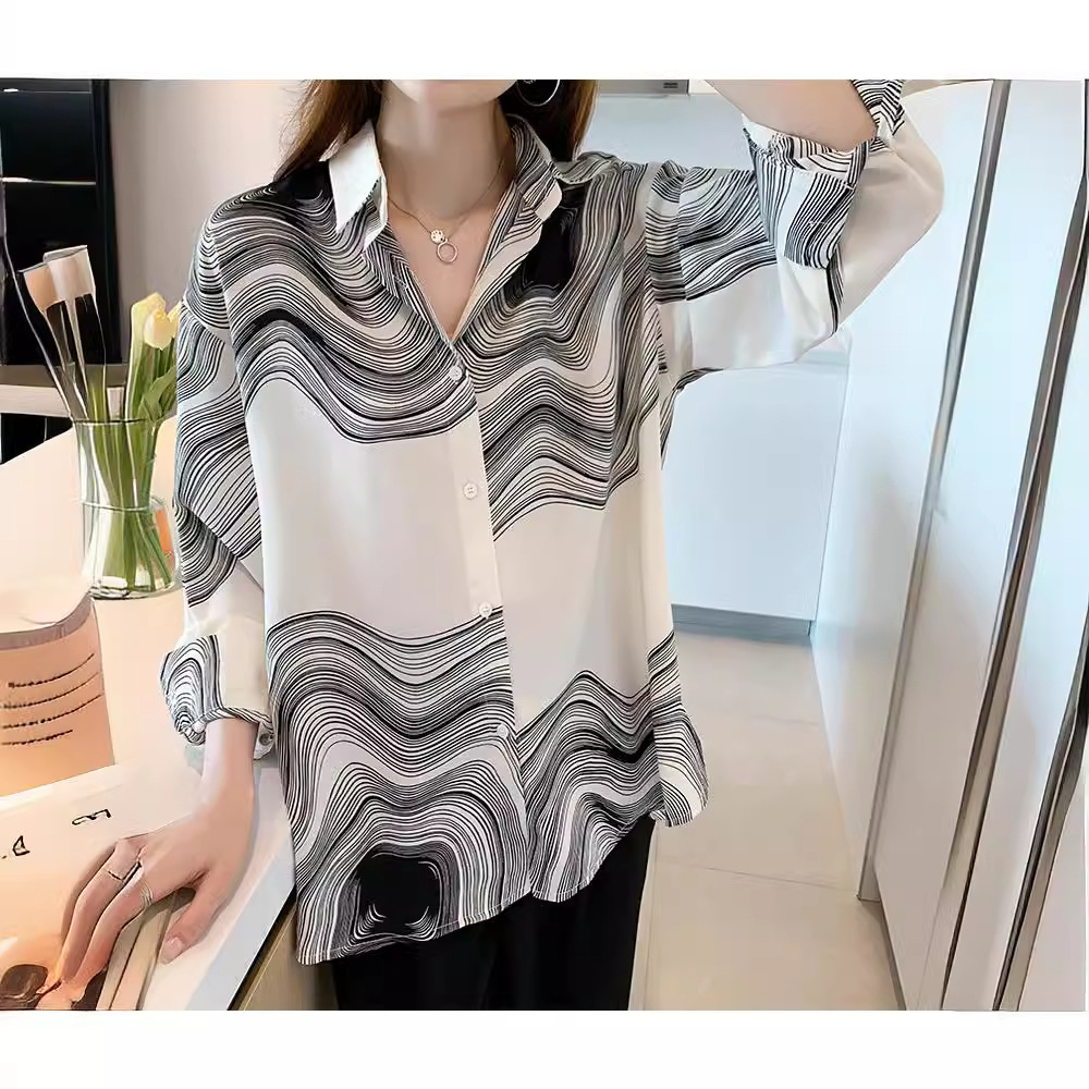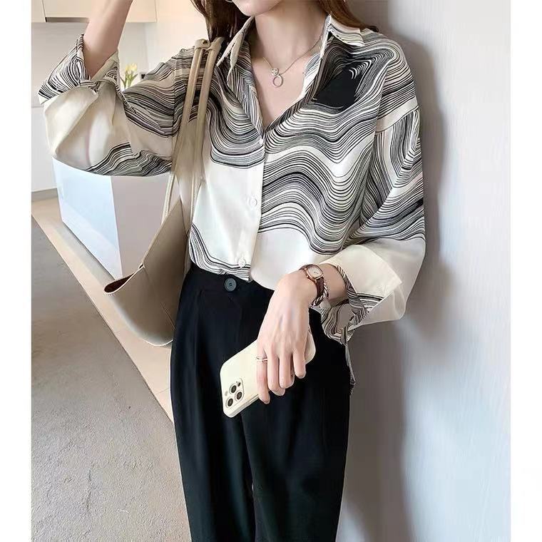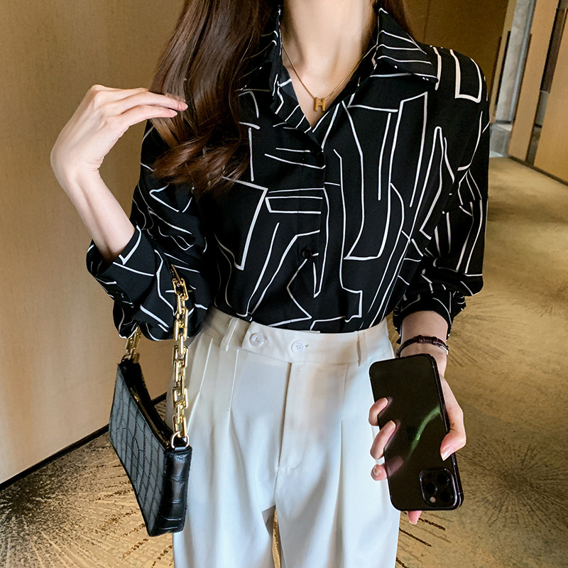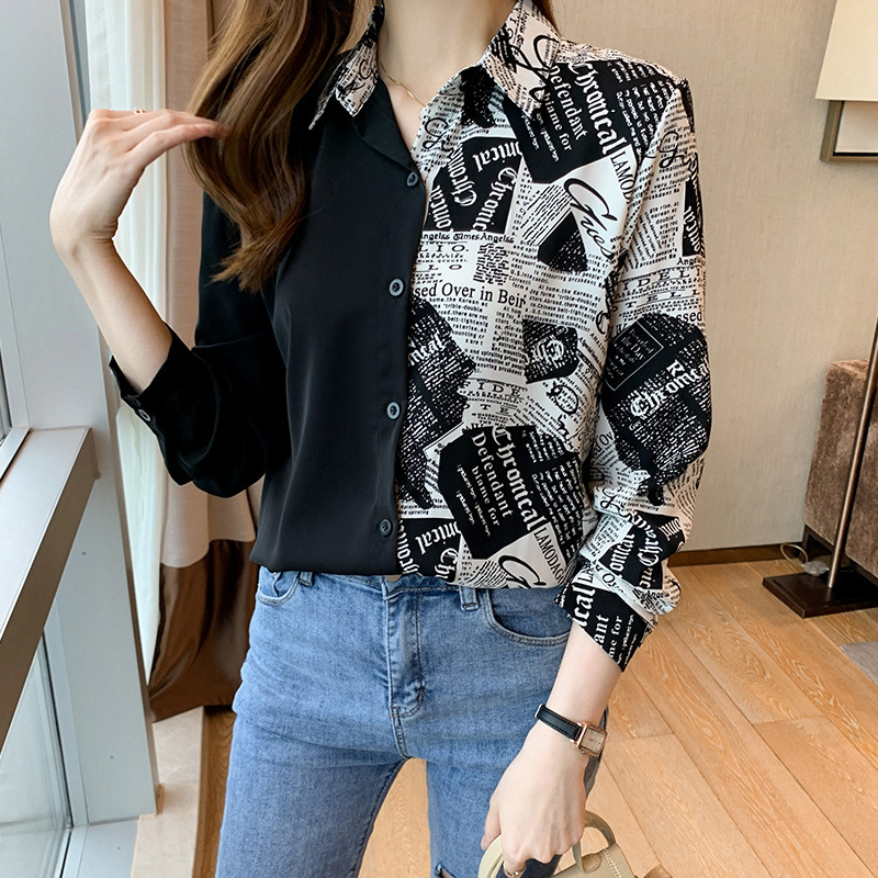 実拍2022秋冬新作韓国版百合ゆるいプリント長袖シャツ女性上着の中にシャツを着ます。