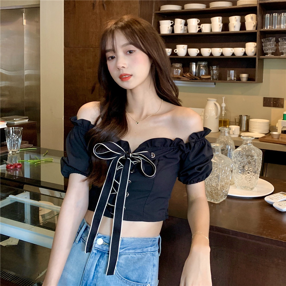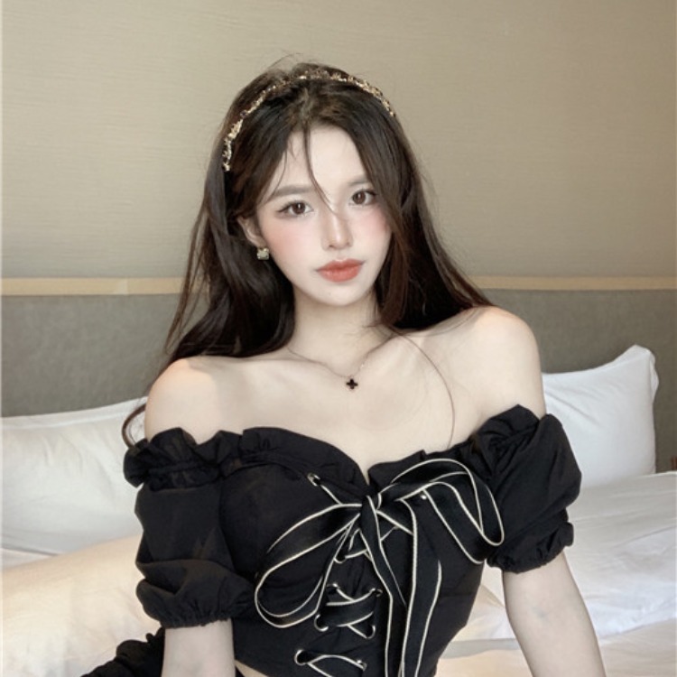 小香ギャルの黒いレースの一字襟の蝶結びのストラップの小さいシャツの短いタイプはやせています。