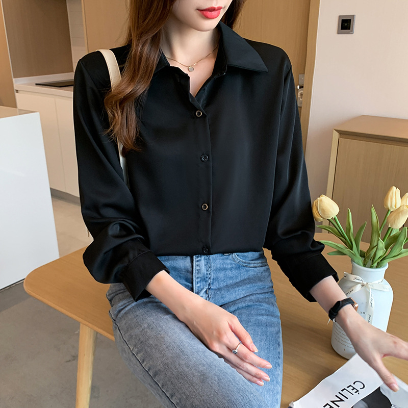 実写 ~ 2022春の新型韓国版レトロでシンプルなシャツの女性の純色の気質はやせている長袖のシャツの女性を現します。