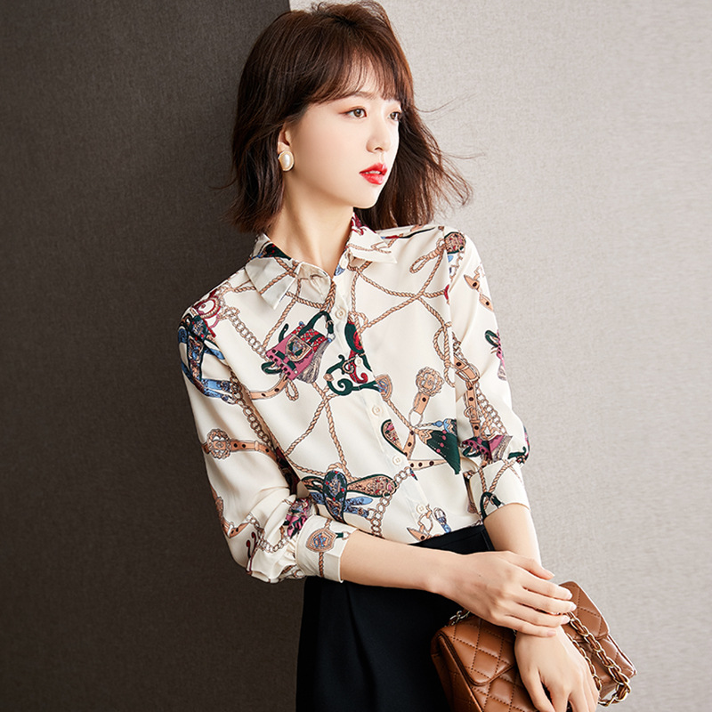 実写プリントシャツ女子秋装レトロな香港風上着女子2021春のデザイン感のある長袖シャツ