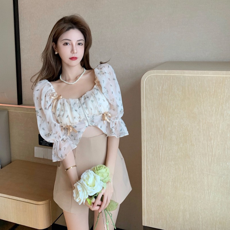 超仙の甘い泡の袖の薄い肩の砕花のシフォンのシャツ + 身を修める気質の高腰のショートパンツ