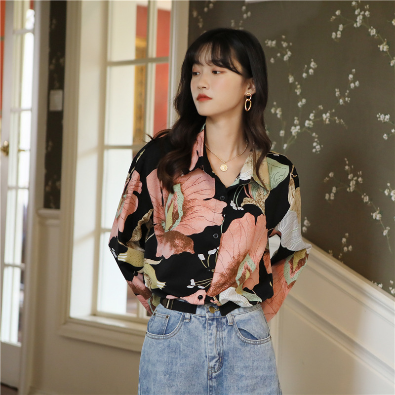 実際にレトロなプリントのシャツの女子学生の韓国版のゆったりしている春秋2022学院の風の砕花のシフォンの上着