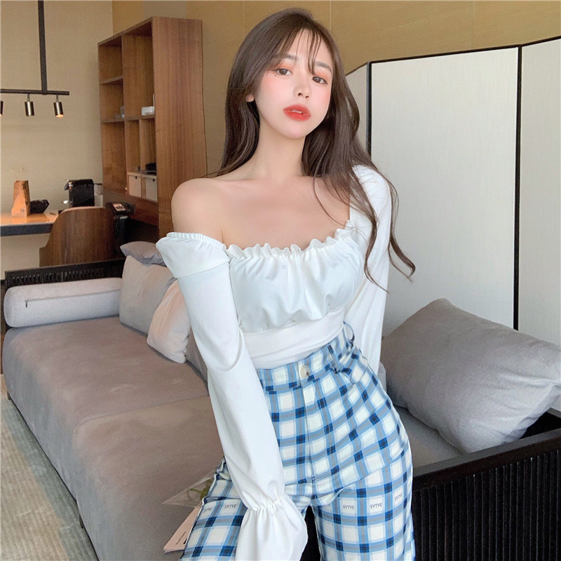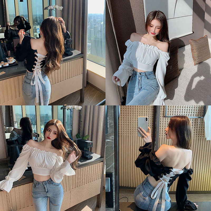 Shopee lazadaの上着のショートタイプの臍の長袖の1字の肩の上着のセクシーな背中はシャツの女性を縛ります。