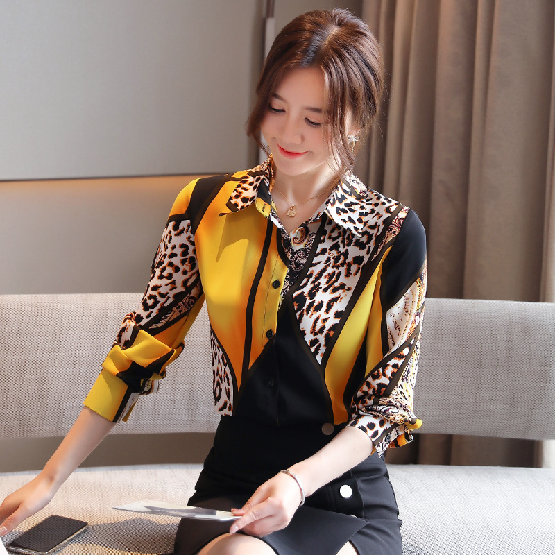 秋の装いの新型の2022韓国版の洋気の百合は色のプリントのヒョウの紋様のシフォンのシャツの女性の上着の長袖のシャツにぶつかります。