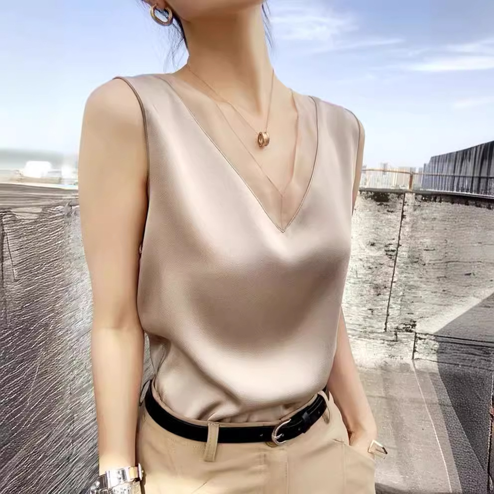 キャミソールの女性のインナースーツの底付き酢酸サテンの上着の夏の前後のvネック