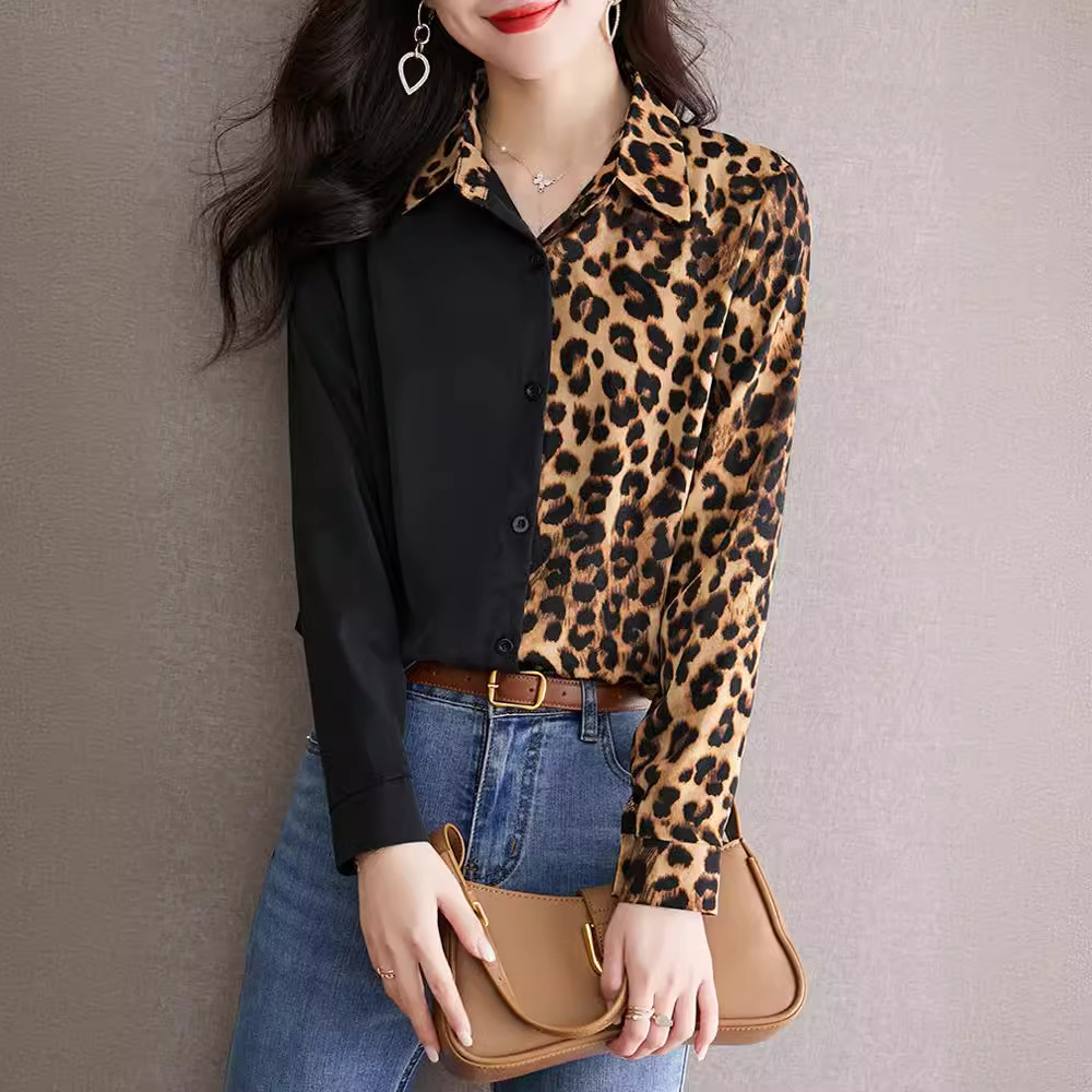 実写2022春の新型豹紋は洋気長袖シャツの女性の高級感がシンプルな上着の潮をつなぎ合わせた