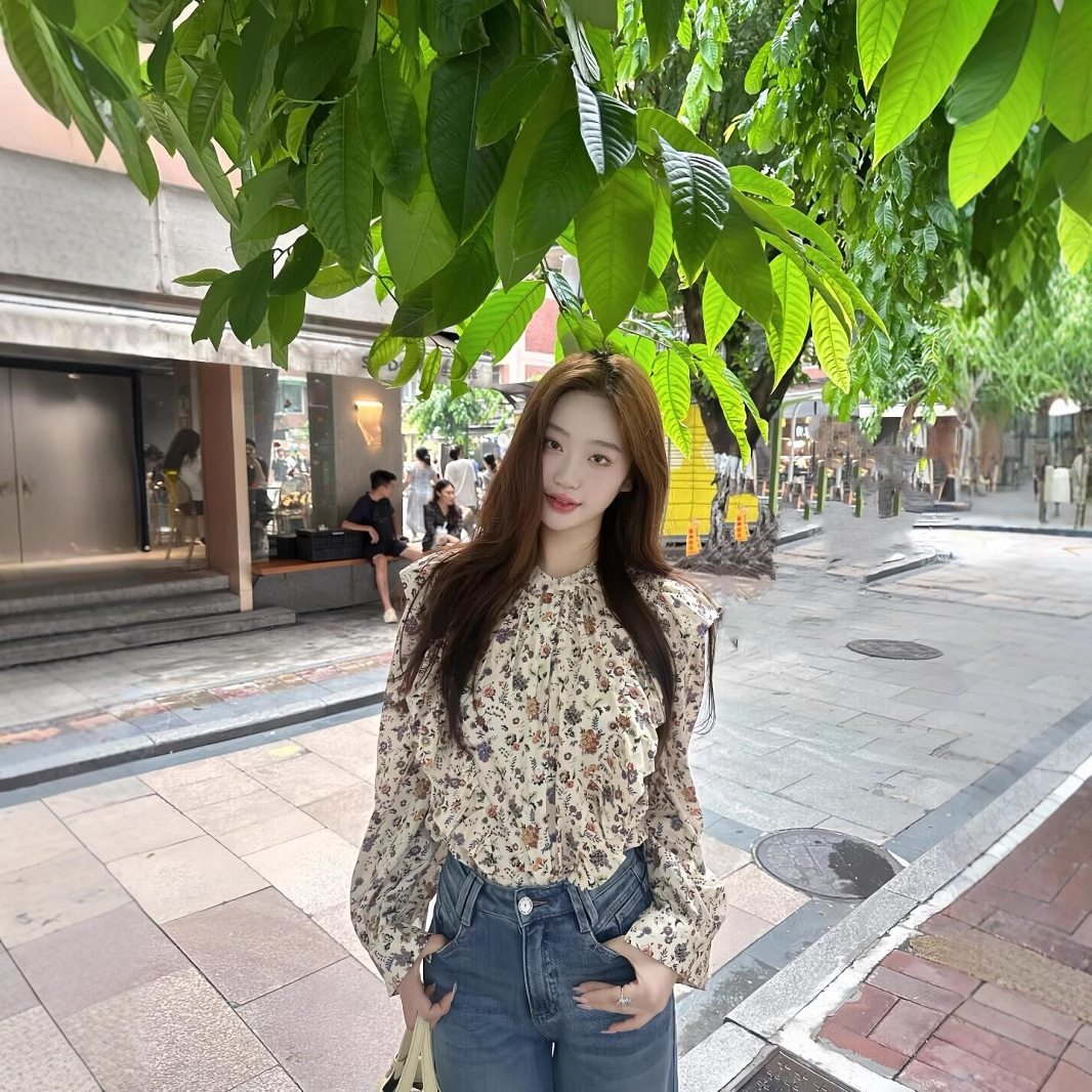 2024年の春の新型の気質はやせている花の長袖のシャツのデザイン感のゆったりしているプリントの上着の女性を現します。