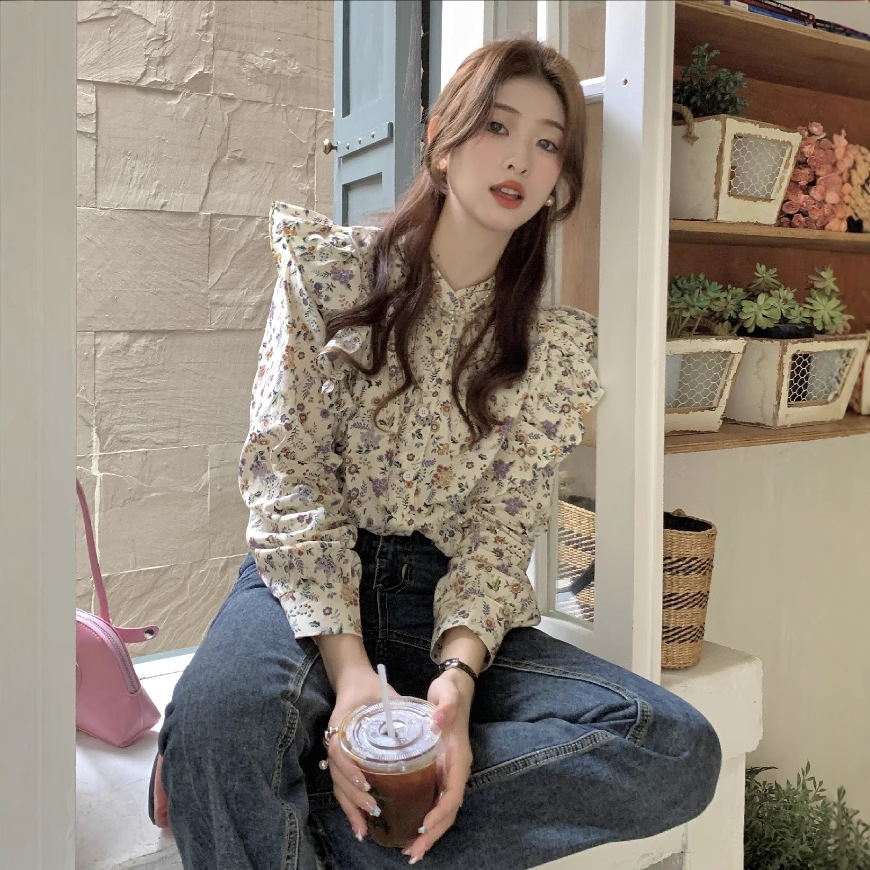 春の新作プラスサイズの女性の服フリル花柄快適なレトロ多用途スリムコットンシャツ女性用