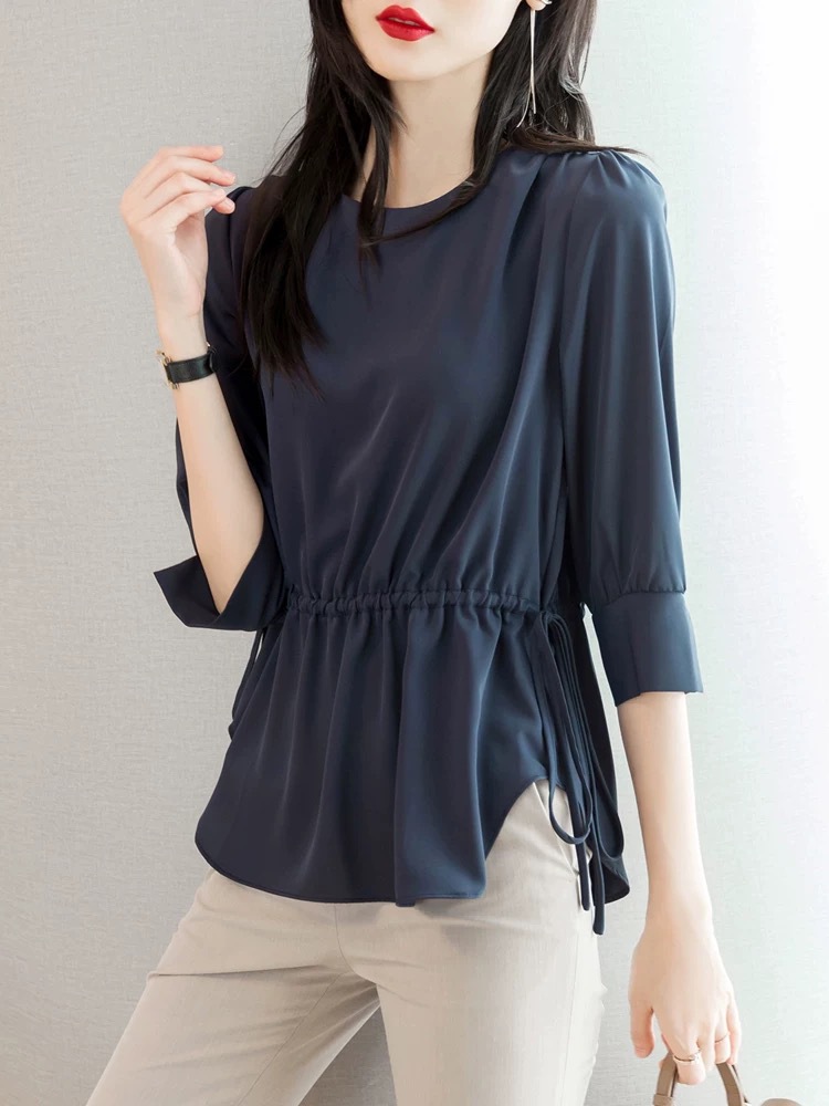 丸首のシフォンのシャツの女性の上着の2025春の服の新型のOLのゆったりしている大きいサイズの洋風の小さいシャツ