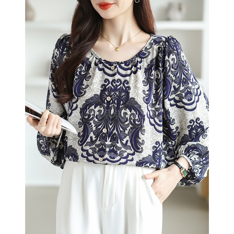実写スポット砕花丸襟シルクシャツ女九分袖2024新夏フランス復古プリントシャツ