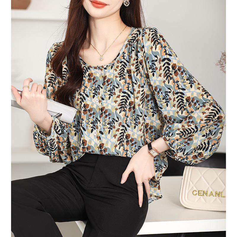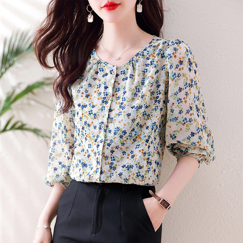 おしゃれなレトロなおしゃれな灯籠袖プリント上着夏の花柄丸襟シャツ